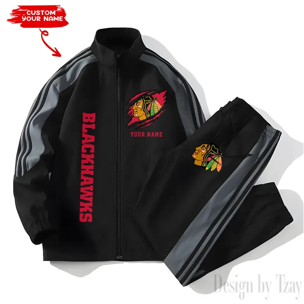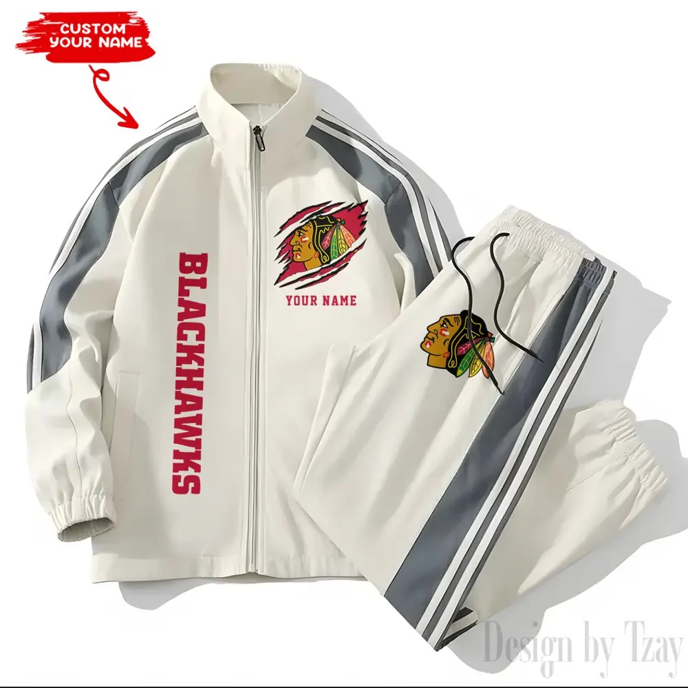 Hi there!! Are you looking at our Chicago Blackhawks Sport Set Jacket & Pants. These Sport Set Jacket & Pants are unique, made with love, and they are perfect accessories for your outfit. The Chicago Blackhawks Emblem on the sport set makes it a perfect item for any Chicago Blackhawks Lovers.