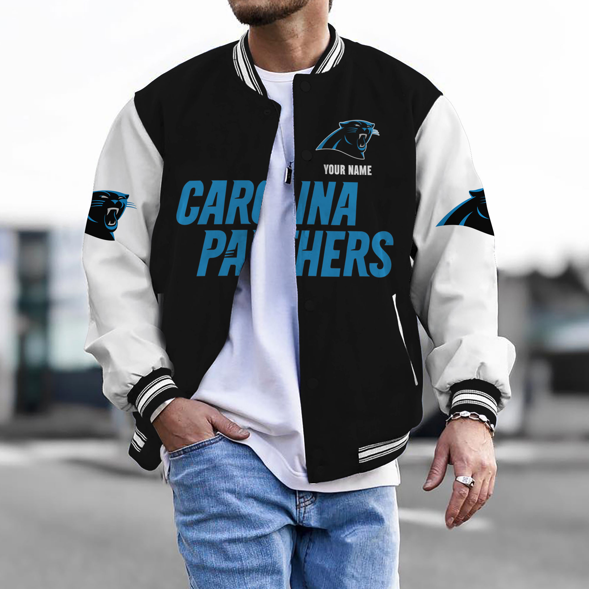 With the launch of the exclusive Made-to-Order service, you can make your Bomber Jacket unique by not only having your special Carolina Panthers Emblem but also your Name printed on the Bomber Jacket.