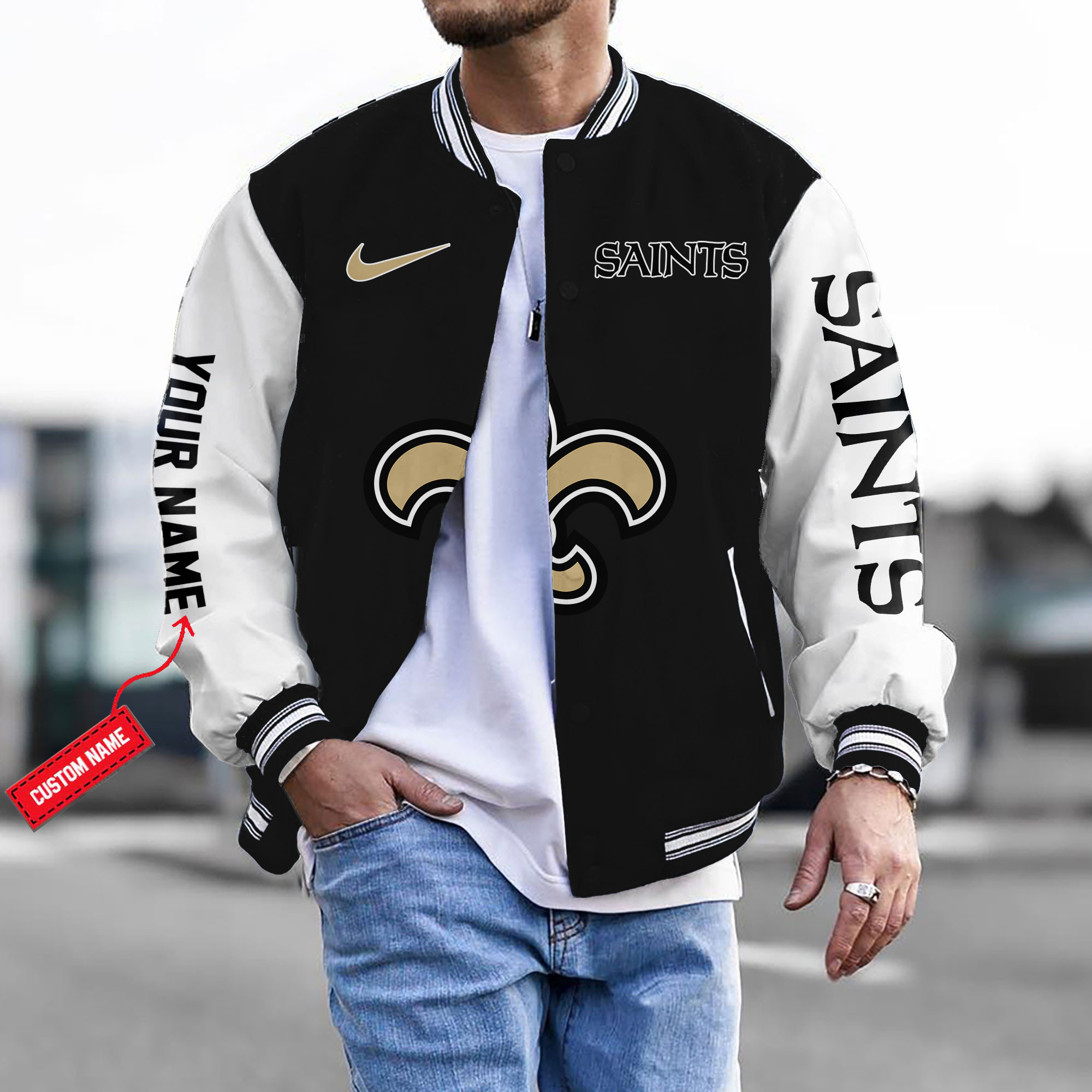 With the launch of the exclusive Made-to-Order service, you can make your Bomber Jacket unique by not only having your special New Orleans Saints Emblem but also your Name printed on the Bomber Jacket.